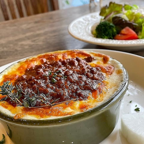 国産の合挽き肉をたっぷりのイタリアン赤ワインで贅沢に仕上げたミートソースは隠し味にセミドライトマトを入れることで飽きのこない味わいに。玉ねぎの甘さとバターの香り引き立つベシャメルソースでバランス良く仕上げました。