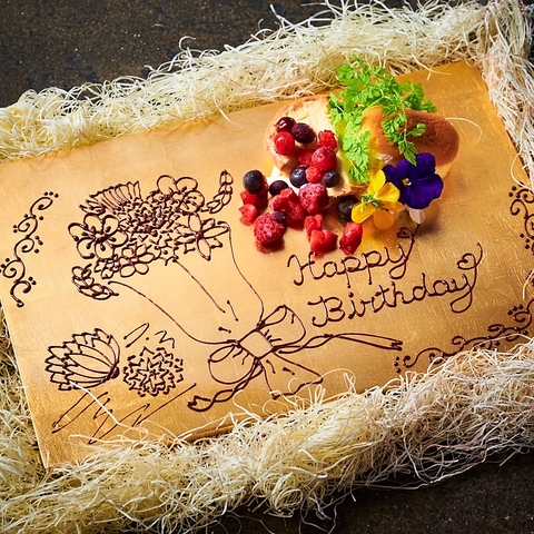 バースデープレート税込1,100円※盛り付けは写真と異なる場合がございます。お祝い・誕生日・記念日など、サプライズも承ります。落ち着いた和モダンの空間で、大切な方と特別なひとときをお過ごしください。-
