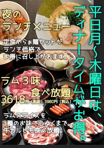 平日月~木限定。ディナータイムもお得なランチ価格で定食やらぁ麺セットがお召し上がりいただけます。