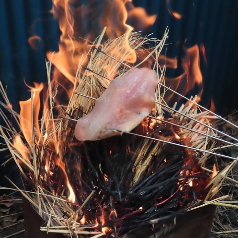 高知県の伝統技法「藁焼き」による鰹のたたきです。一気に燃え上がる藁の強火力(約800~900℃)で表面を瞬時に焼き上げることで、生臭さを消し、芳醇な香りを纏わせます。中はレアな状態を保ち、皮目の脂を活性化させるこの製法は、まさに豪快な炎の芸術。塩やにんにくを添えて、出来立てを頂くのが醍醐味です。