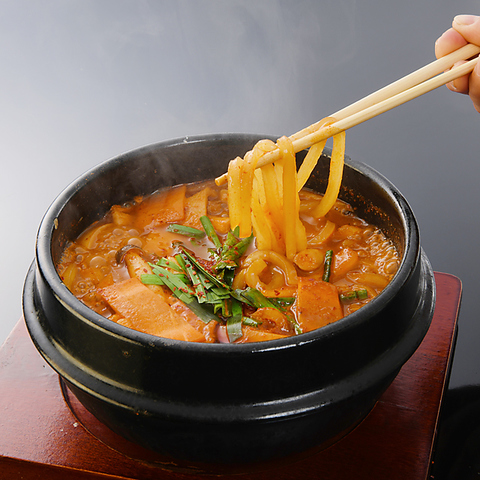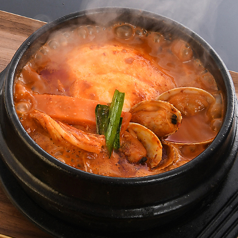 肉、野菜、豆腐などチゲの材料と共に、ソーセージやスパム、インスタントラーメンの麺などを辛く味付けしたスープで煮込んだ鍋料理。元々は韓国の軍隊で食べられていて、朝鮮戦争以降、米軍から流れてきたスパムやソーセージをキムチチゲに入れたのが始まりです。