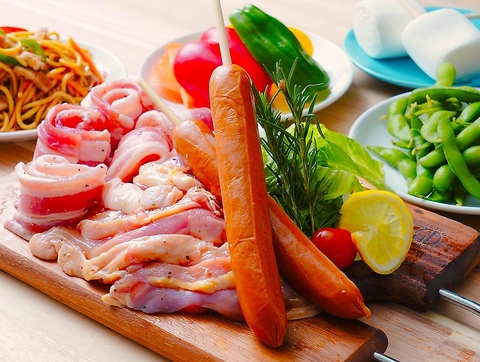 【セット内容】・国産豚カルビ 約80g・国産牛カルビ 約50g・国産豚ヒレ 約50g・タレ漬けホルモン 約80g・塩だれポーク 約150g・鶏モモレモンペッパー 約150g・BBQ野菜・焼きそばセット・枝豆&マシュマロ ※内容量表記:1人前※利用料金が別途かかります。※画像はイメージです。
