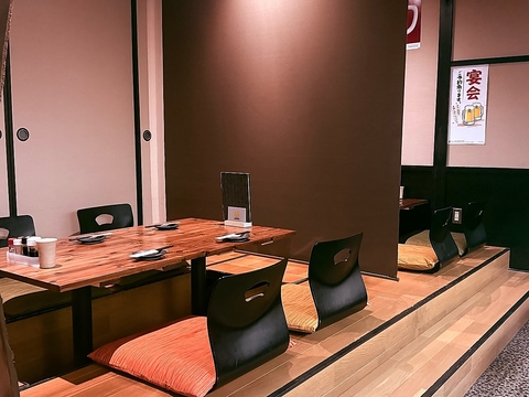 掘りごたつ席でゆったりお食事をお楽しみください。のれんを下ろすと半個室になります。