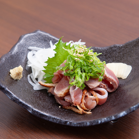 鹿児島県から直送のもものたたきです。しっかりとした弾力のある歯応えと旨みが凝縮された一品。お醤油も九州から取り寄せた甘口のお醤油でお召し上がりください。おろし生姜とにんにくで旨さ倍増です。