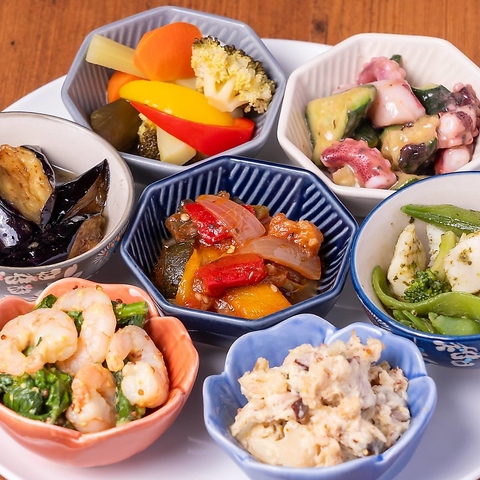 地元野菜や国産のお肉など食材にこだわってつくられる定番おつまみや旬の食材が楽しめるメニューなど幅広いお食事が楽しめます。和食&イタリアン&アメリカンなバル料理にジビエ料理などやみつきフードも楽しんでください!小皿料理は350円から気軽に楽しめます