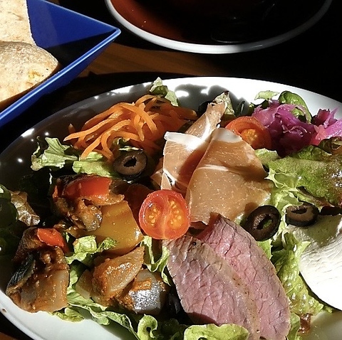 ランチメニューは、選べるメインにミニサラダ、スープ、パン3種付!季節ごとに限定メニューも◎