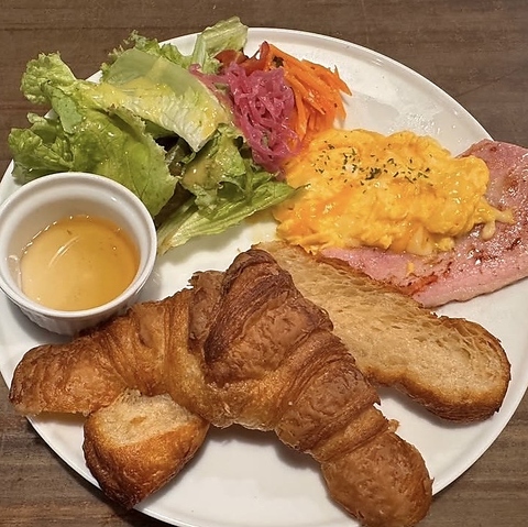 人気のクロワッサンをプレートに。ベーコンとチーズエッグ付き。食物繊維豊富のアガベシロップとご一緒にお召し上がり下さい。