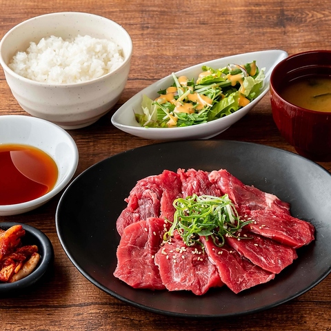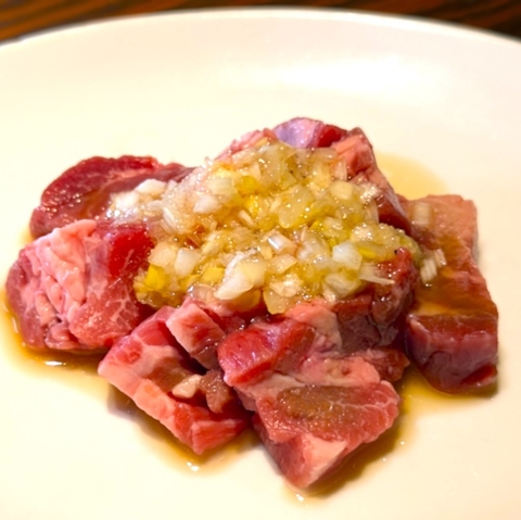 焼肉店における肉のカットは非常に重要です。切り方により、肉の旨みや柔らかさに違いが出るからです。どの部位をどうカットするかを職人が知りつくし熟練の手法によりひとつひとつ丁寧にカットしているのです。肉の塊から筋引き、成形と呼ばれる作業を経て、お客様の食べやすい大きさに一枚一枚愛情をこめて切り出しています◎