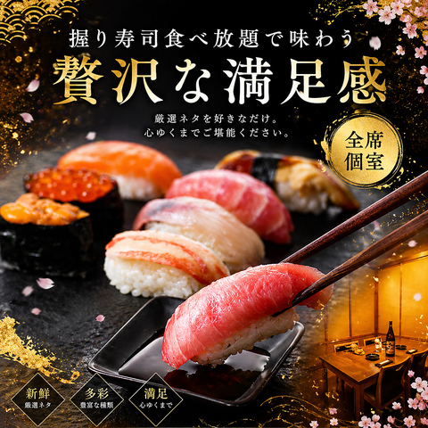 厳選された新鮮な魚介を使用し、職人が一貫ずつ丁寧に握る本格寿司を食べ放題で楽しめる贅沢なプラン。定番のまぐろやサーモンはもちろん、季節のおすすめネタも豊富にご用意しております。お好きなだけ味わえる満足度抜群の内容で、宴会や飲み会にもぴったりのコースです。大切なひとときを彩ります。ぜひご利用ください。