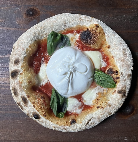 新鮮なブッラータチーズが贅沢に使用された、至福の一皿。クリーミーなチーズと、トマトソース、バジルのハーモニーが絶妙。自家製でサクッと軽い食感の生地が相性抜群です。