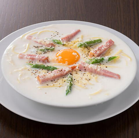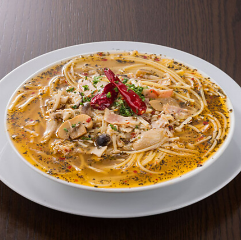 看板メニューの絶望のスパゲティは、リピーター続出の将に悪魔な逸品。覚悟をもってご賞味ください!自家製ミートソースに生クリームとオリーブを加えニンニクと唐辛子でパンチを効かせた、濃厚スープソースにキノコベーコンソテーをトッピングした具沢山でやみつきになる、唯一無二のミートクリームスープスパゲッティ。