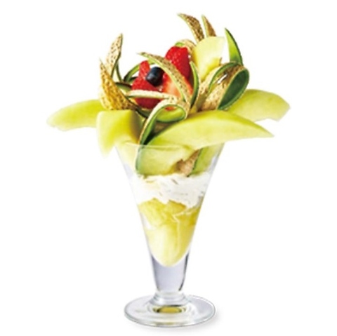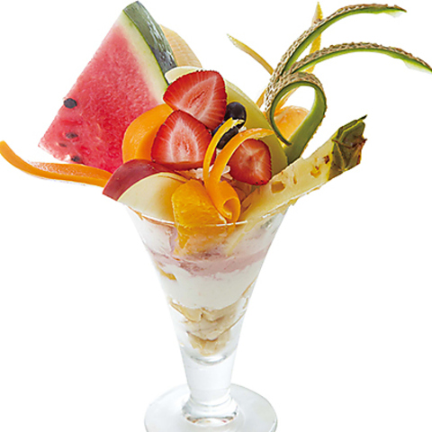 果実園の真骨頂とも言うべきフルーツパルフェ。りんご・スイカなどの約10種類のフルーツと、季節のフルーツシャーベットとアイスクリームが加わります(フルーツは時季によって変動があります)。常に新鮮な今が食べ頃のフルーツを盛り込んでいます。フルーツもアイスクリームもシャーベットも何もかも食べたい方に◎