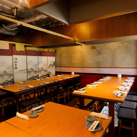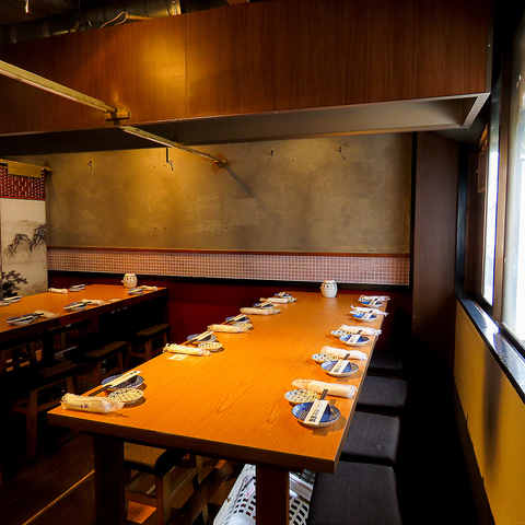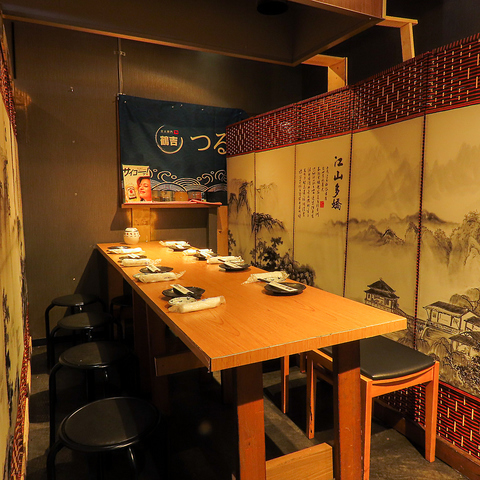 少人数様の接待.団体様の二次会,同窓会,女子会までご宴会のスタイルに合わせたテーブル席をご用意しております。やわらかい照明と和を基調とした調度品に彩られたお部屋は時間を忘れてゆったりと寛げます。3時間飲み放題付プランもご用意しておりますので、厳選理に舌鼓を打ちながら美味しいお酒をご堪能ください。