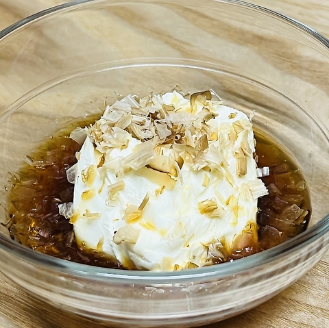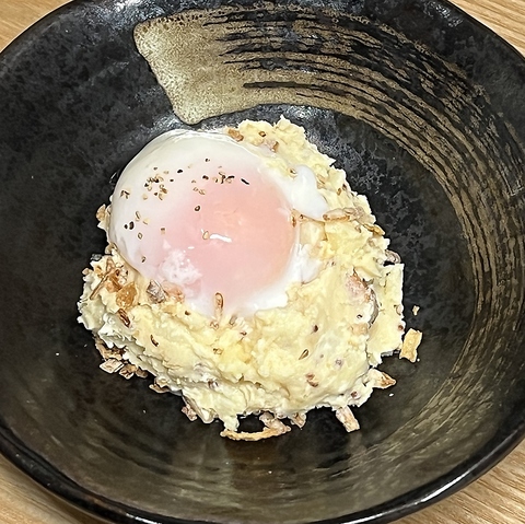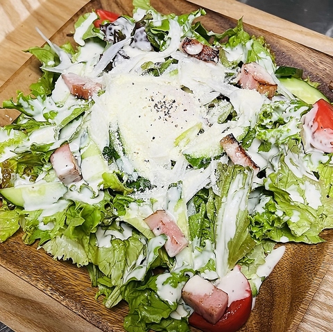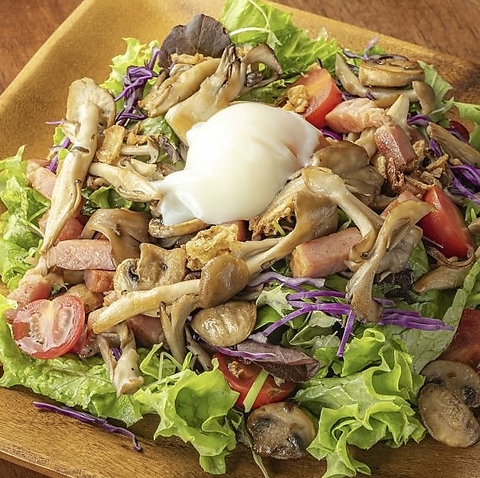 新鮮な野菜と旬のきのこがたっぷり入ったサラダ。シャキシャキの葉物野菜と甘酸っぱいトマト、カリカリのベーコンが絶妙にマッチ。中心にはとろりとした温泉卵が乗り、クリーミーな味わいをプラスします。栄養満点でヘルシーな一品ですので、ぜひご賞味ください。お得なハーフサイズ770円(税込)もあります。