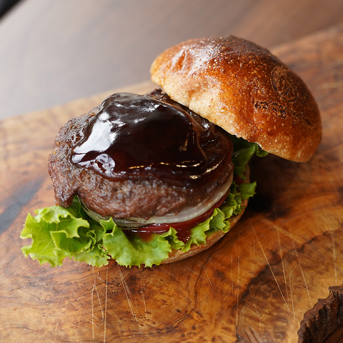 パティ、全粒粉バンズ、ローストオニオンと具材はシンプルに。薪の燻製香をしっかりとお楽しみいただける、なぎさのハンバーガー入門バーガーです。