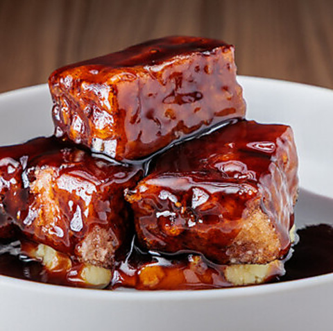 当店人気ナンバーワン!!!酢豚の概念を変える新しい酢豚 ,外はカリっと香ばしく驚くほど柔らかい豚肉そこに黒酢のやさしい酸味とほのかな甘みが絶妙に重なり、後味はくどくない。ひと口食べれば箸が止ま未ません!黒酢ソースはお客様の目の前でかけさせて頂きます!