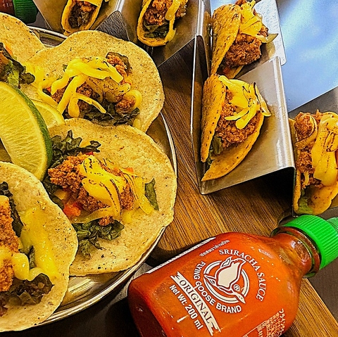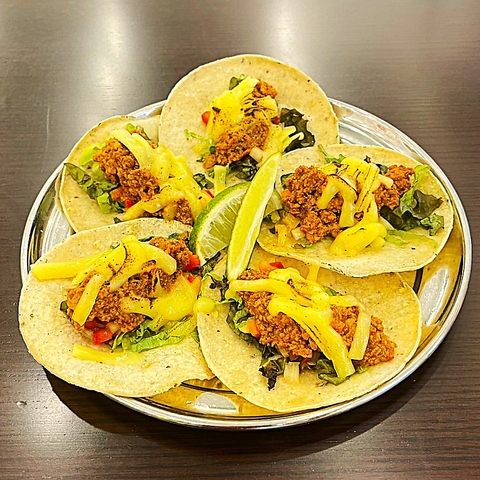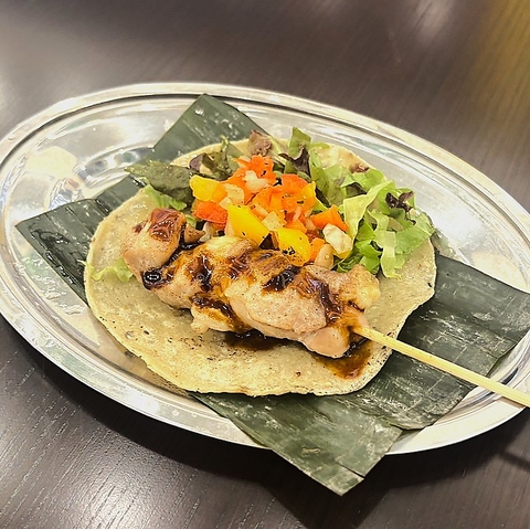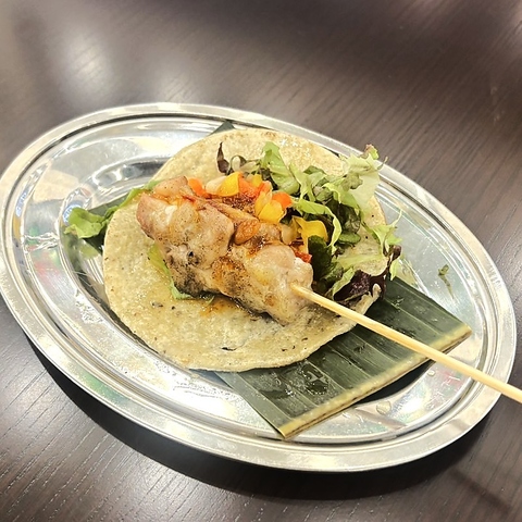 タンドリーで焼き上げた焼き鳥をタコスにした絶品メニューです。新感覚のタコスを是非食べて下さい。甘辛くスイートチリか辛いシラチャーをお好みで!