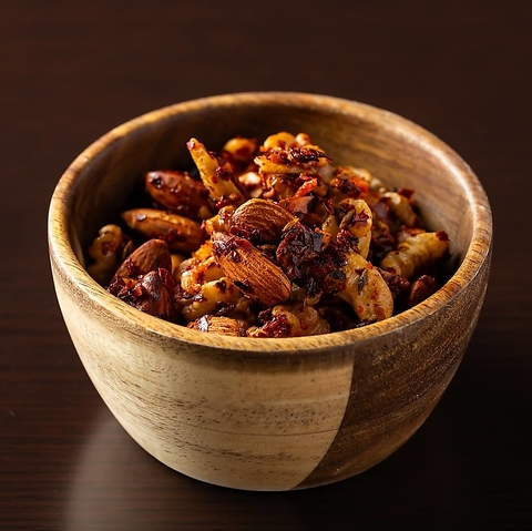 甘辛スパイスをまとったクセになるミックスナッツ。つまみ出したら止まらない。