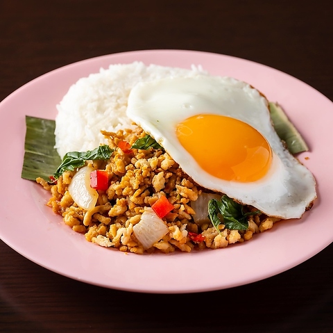 バジル香る鶏ひき肉炒め。目玉焼きを崩して混ぜれば止まらぬ旨辛タイの定番飯。