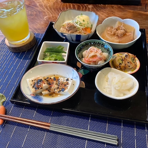 【心安らぐ、手作りの温もりを感じる空間】落ち着いた雰囲気の中で心和む家庭の味を楽しめる隠れ家的なお店です。改装された和風住宅の中、木の温もりを感じるテーブルで、旬の地元食材を使用した料理を味わいながら、リラックスしたひとときをお過ごしください。