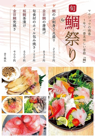 マルジョウの晩春 1年で一番美味しい季節『鯛』。鯛のお刺身5点盛りなど晩春をタオ移管できるメニュー等◎