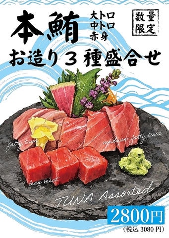 本鮪お造り3種盛り合わせを2800円でご提供!圧倒的コスパで新鮮な本鮪を食べれるのは4月中だけ♪