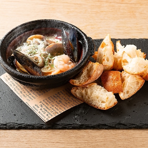 メニュー選びに迷ったらまずはコレ!オリーブオイルとにんにくをきかせたアヒージョは魚介をふつふつ煮込むことにより食材の味がオイルに染み込み、美味しい香りを漂わせます。バケットは追加もございます!そのまま具をつまむだけでなく、バケットに具をのせたり、旨みが凝縮されたオイルに浸したりと、お召し上がり方は様々★