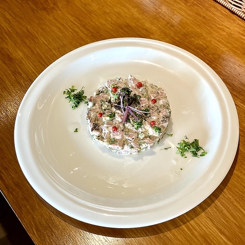 フランス北東部アルザス地方の伝統料理。茨城県産豚のかたまり肉と発酵キャベツ、じゃがいもをじっくり煮込んだ温かい一品。自家製ハーブソーセージ付。豚と野菜の旨みが口の中に広がります。白ワインとの相性抜群◎2名様でシェアできるボリュームでご提供いたします。