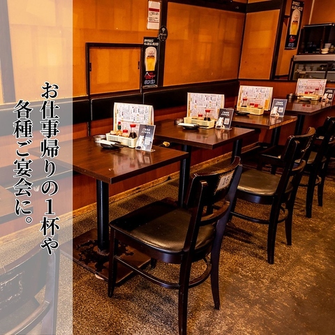 広々とした店内にあるテーブル席は、お一人様はもちろんのこと、カップル、ご友人との飲み会、そして大人数の宴会まで、様々なシーンでご利用いただけます。