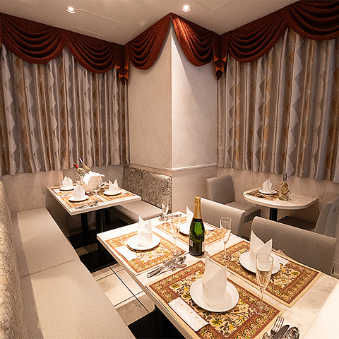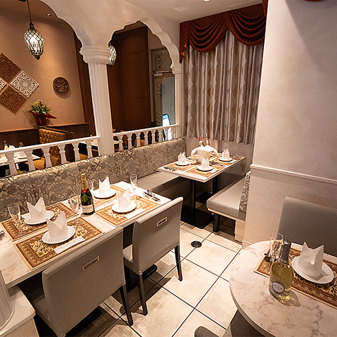 店内のあちこちにはインドの絵画や装飾品が飾られており、非日常空間を演出しております。お食事と共に、五感で楽しむひとときをお過ごしください。