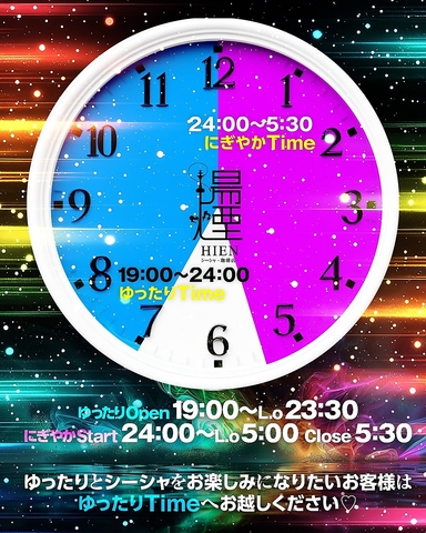 月、火、木~日、祝日、祝前日: 19:00~翌5:30 (料理L.O. 翌5:00 ドリンクL.O. 翌5:00) 最終入店:翌3:00 |