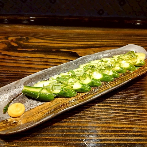 パリッと瑞々しいきゅうりに、粒感残るもろみ味噌の深いコク。素材の良さが際立つ、日本酒が進む名脇役。 Crisp, fresh cucumber served with savory Moromi miso paste. The deep umami of the fermented soybean paste perfectly highlights the vegetable's freshness.