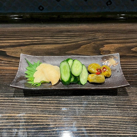 旬の野菜が織りなす彩りと、丁寧に引き出された素材の旨味。心地よい食感と塩気が、お酒の合間に安らぎを与える。 A colorful assortment of seasonal vegetable pickles. Each variety offers a unique crunch and savory depth, serving as the perfect palate cleanser.