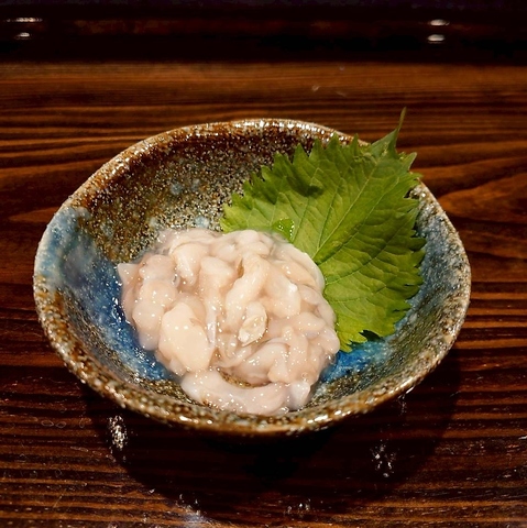 ツーンと鼻に抜けるワサビの刺激が、タコの食感と甘みを引き立てる。酒のペースを加速させる、不動の定番珍味。 Fresh raw octopus marinated in pungent wasabi. The sharp spicy kick and chewy texture create an addictive harmony that pairs perfectly with drinks.