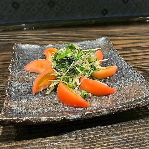 完熟トマトの甘みに、たっぷりの薬味が鮮烈な香りを添える。口当たり爽やかで、こってりした料理の合間に欲しくなる一皿。 Ripe tomatoes garnished with plenty of aromatic herbs. A refreshing salad with a zesty kick, perfect for cleansing the palate between rich dishes.