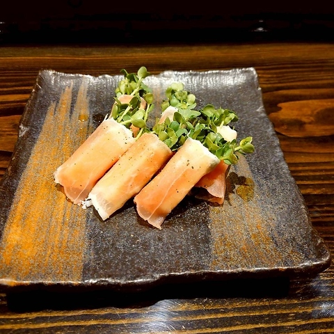 生ハムの熟成された旨味が、カイワレの爽やかな辛味を優しく包む。シャキッとした食感と絶妙な塩気が、お酒を誘う。 Fresh radish sprouts wrapped in savory prosciutto. The crisp texture and mild spice of the greens perfectly balance the rich, salty ham