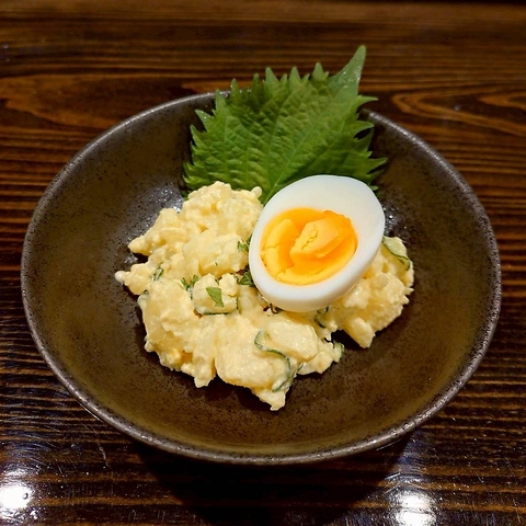 料理長秘伝の隠し味で、ポテトの甘みを奥深くする。日本酒を呼ぶ大人のための和製ポテサラ。 A Japanese twist on the classic. Creamy potatoes seasoned with dashi and soy sauce, topped with savory bonito flakes for umami.