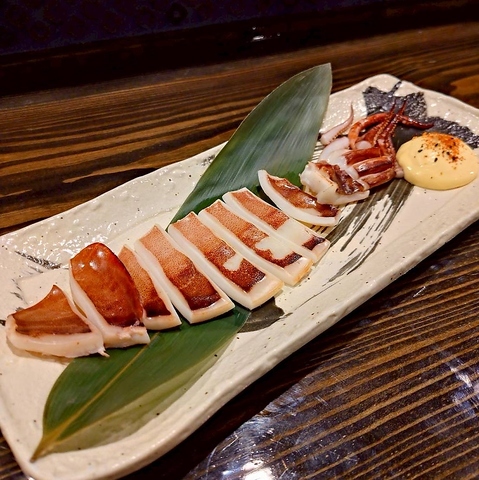 肉厚な身に凝縮された濃厚な旨味。炙った香ばしさとプリプリの弾力が、酒の杯を自然と進ませる。 Overnight-dried squid grilled to perfection. The drying process concentrates the umami, creating a plump, meaty texture that pairs beautifully with sake.