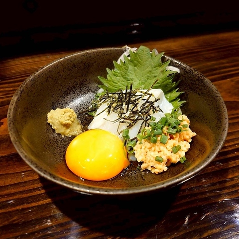 イカのプリッとした食感と、納豆の濃厚な粘りが絶妙に絡み合う。シンプルながら奥深い、酒飲みにはたまらない最強コンビ。 Fresh raw squid strips mixed with sticky fermented soybeans. The combination of chewy and sticky textures creates a savory, umami-rich classic.