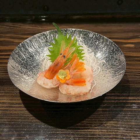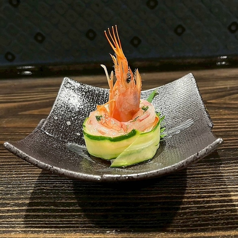 赤海老の濃厚な甘みを、梅酢の爽やかな酸味がキリッと引き締める。淡いピンクが目にも美しく、さっぱりとした後味が日本酒を誘う上品な一皿。 Sweet red shrimp marinated in refreshing Japanese plum vinegar. The delicate tartness perfectly balances the shrimp's richness, creating a light and elegant appetizer.