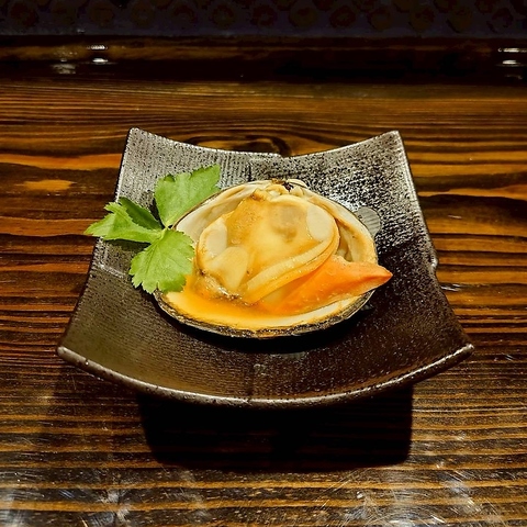 過剰なくらい下処理をし、焼き場でグツグツと煮立つ出汁醤油の香ばしさと、濃厚な磯の香り。コリコリとした身の歯ごたえと、肝のほろ苦さがたまらない、酒飲みのための極上珍味。 Turban shell grilled in its own shell with savory soy broth. The aroma of the ocean and the bubbling sauce is irresistible. Enjoy the firm texture and the sophisticated bitterness of the liver.