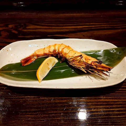 殻ごとバリッと焼き上げた香ばしさと、中から溢れるプリプリの身の甘み。シンプルに塩だけで素材の旨味を極限まで引き出した、豪快な一尾。 A large, whole shrimp grilled simply with salt to highlight its natural quality. Enjoy the aromatic, crispy shell and the plump, sweet meat inside.