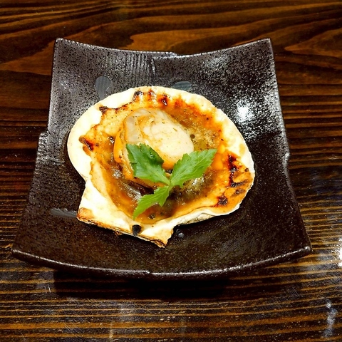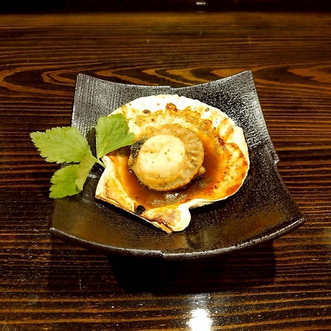 溶け出したバターの芳醇なコクと、焦がし醤油の香ばしさ。肉厚なホタテの甘みと絡み合う、反則級に旨い王道の組み合わせ。 Grilled scallop topped with melting butter and savory soy sauce. The rich, aromatic combination perfectly enhances the natural sweetness of the shellfish.