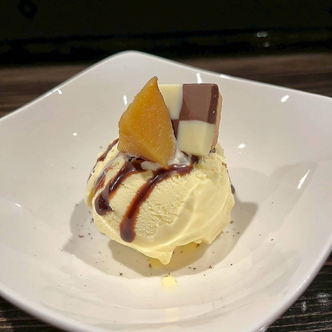 ほっこりとしたさつまいもの自然な甘みと、冷たいバニラアイスが絶妙に溶け合う。とろり濃厚なチョコソースがコクをプラスした、食後の別腹デザート。 The comforting natural sweetness of sweet potato pairs perfectly with cold, creamy vanilla ice cream. Drizzled with rich chocolate sauce for a satisfying finish.
