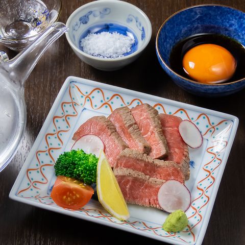 黄金色の輝きを放つ出汁巻きは、濃厚な甘みとコクが広がる「夢王卵」を使ったこだわりの一品。ふっくらとジューシーで、口の中でとろけるような食感をお楽しみ頂けます。そのほか、旬魚のお造りや活車海老の塩焼き、黒毛和牛や伊勢赤どりを使った贅沢な肉料理もおすすめです。種類豊富な焼酎・日本酒と合わせ、じっくりとご堪能くださいませ。