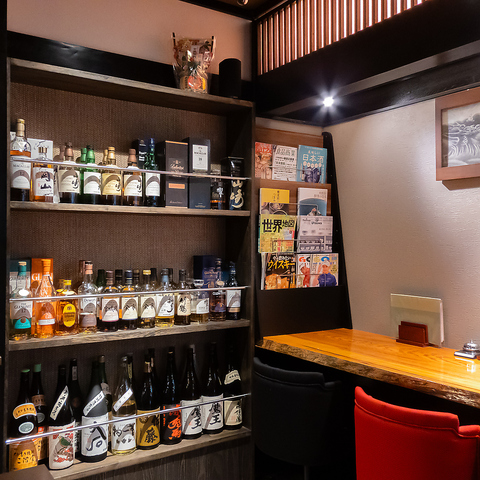 【理の余韻を深める、特等席の傍らの「銘酒の誘い】当店のカウンター席に腰を下ろすと、まず目に飛び込んでくるのは、整然と、しかし圧倒的な存在感で並ぶ数々のお酒です。十割そばの香り、そして瀬戸内の鮮魚の旨みを最大限に引き立てるために誂えられた、いわば「料理の最後を完成させる調味料」としての選りすぐりです。
