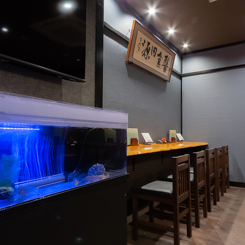 「扉を開けると、木の温もりを感じる和モダンな空間が広がります。柔らかな照明がテーブルを照らし、静かな時間を演出。店内の生簀には新鮮な活魚もご用意しております。ビジネスの緊張感を和らげる、上質なひとときをお過ごしください。」