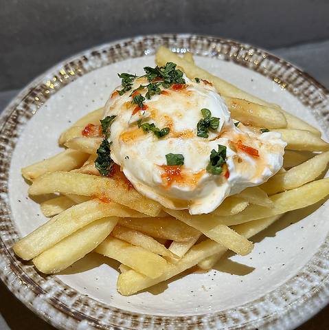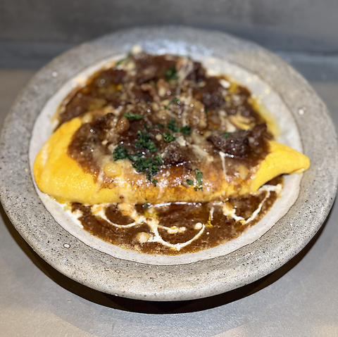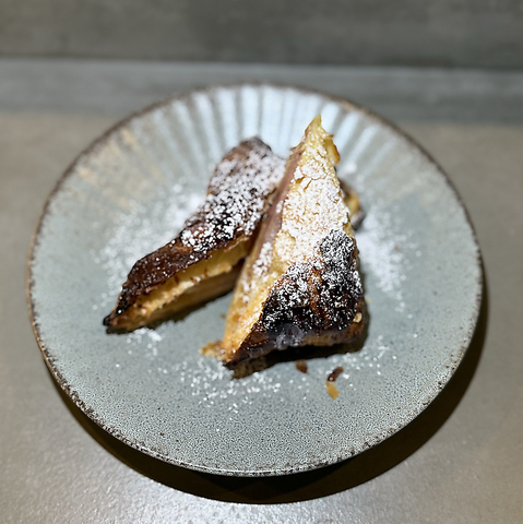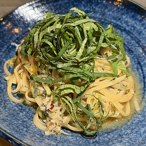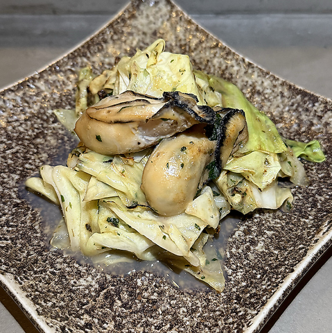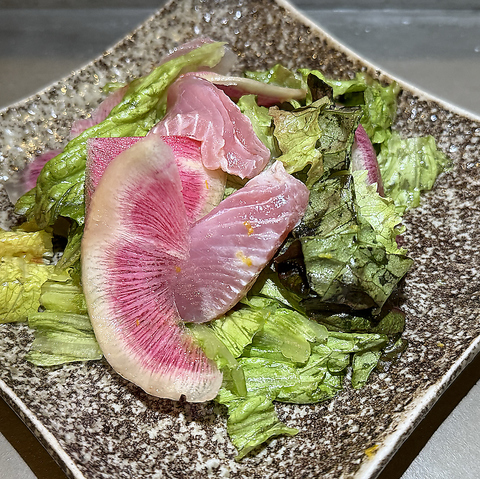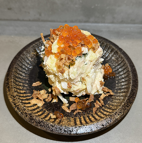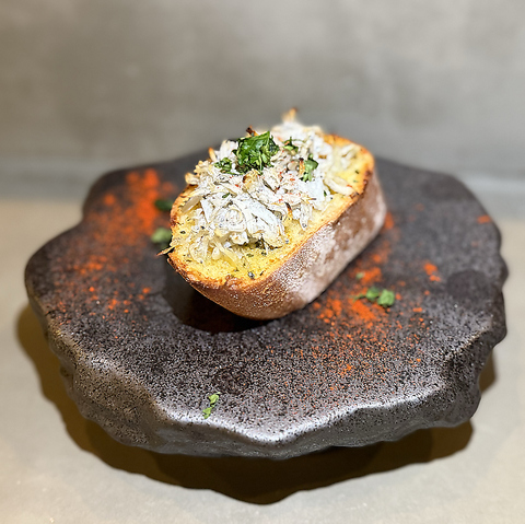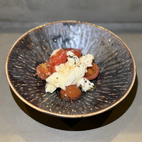 プリッとしたアーサーの天ぷらに、柚子胡椒の爽やかな風味を効かせた出汁ジュレをたっぷり添えた一皿。ジュレが天ぷらの旨みを引き立て、軽やかな酸味とピリッとした柚子胡椒のアクセントが口の中で広がります。見た目も涼やかで華やか。お酒のお供としても楽しめる、新感覚の天ぷらメニューです。