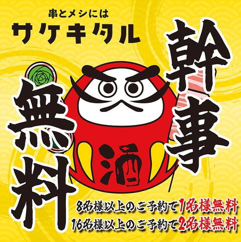 サケキタルではあらゆるシーンに合わせて宴会プランをご用意致しました。自慢の串料理を中心にお得なラインナップ!団体席も大小様々ご用意があるので安心してご予約ください♪
