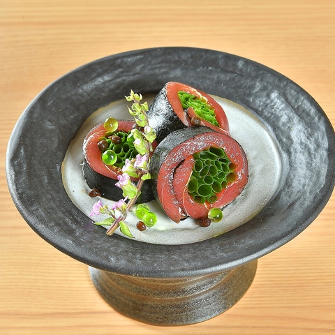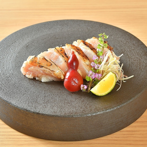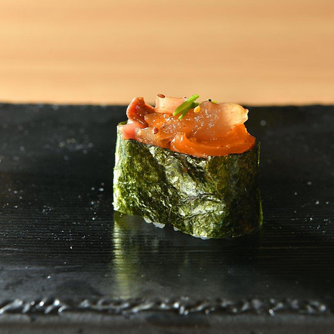 黒毛和牛のロース山椒焼き、さつま極鶏塩レア焼き、伊勢屋味噌の漬けチーズなど、素材一つひとつと向き合った一品料理をはじめ、天ぷらなど和の技法を活かした料理を豊富にご用意。寿司の合間に楽しむ一皿としても、料理を目当てに訪れても成立する構成となっております。